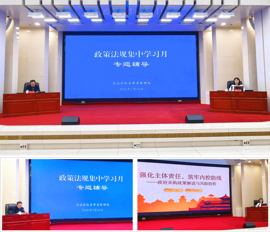 按照宁夏机关事务管理局2026年法治建设工作部署,3月是宁夏机关事务管理局的“政策法规集中学习月”。作为“学习月”的重头戏,此次政府采购专题辅导邀请自治区财政厅政府采购处深耕多年的舒心同志前来授课。从形势研判到法治根基,从内控核心到风险图谱,再到行动清单,课程从五个维度层层递进,把看似枯燥的政策法规讲得入脑入心。