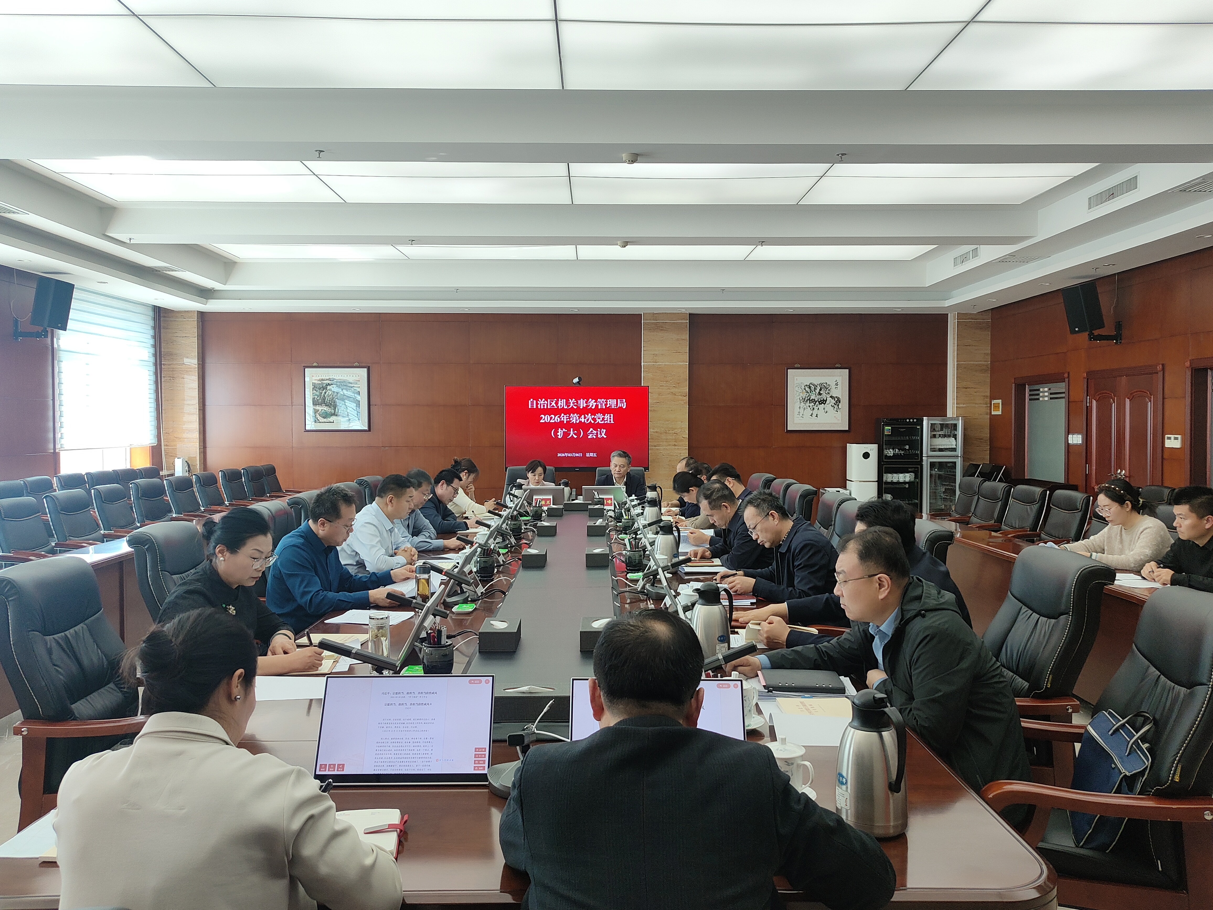 3月6日,自治区机关事务管理局召开党组(扩大)会议,传达学习了习近平总书记重要文章《让愿担当、敢担当、善担当蔚然成风》和关于树立和践行正确政绩观的重要论述、中央党的建设工作领导小组会议、自治区党委党的建设领导小组(扩大)会议及有关通知精神,审议了《自治区机关事务管理局树立和践行正确政绩观学习教育工作清单》,对局系统开展树立和践行正确政绩观学习教育工作进行动员部署。局党组成员、各处室(单位)负责同志参加会议。
