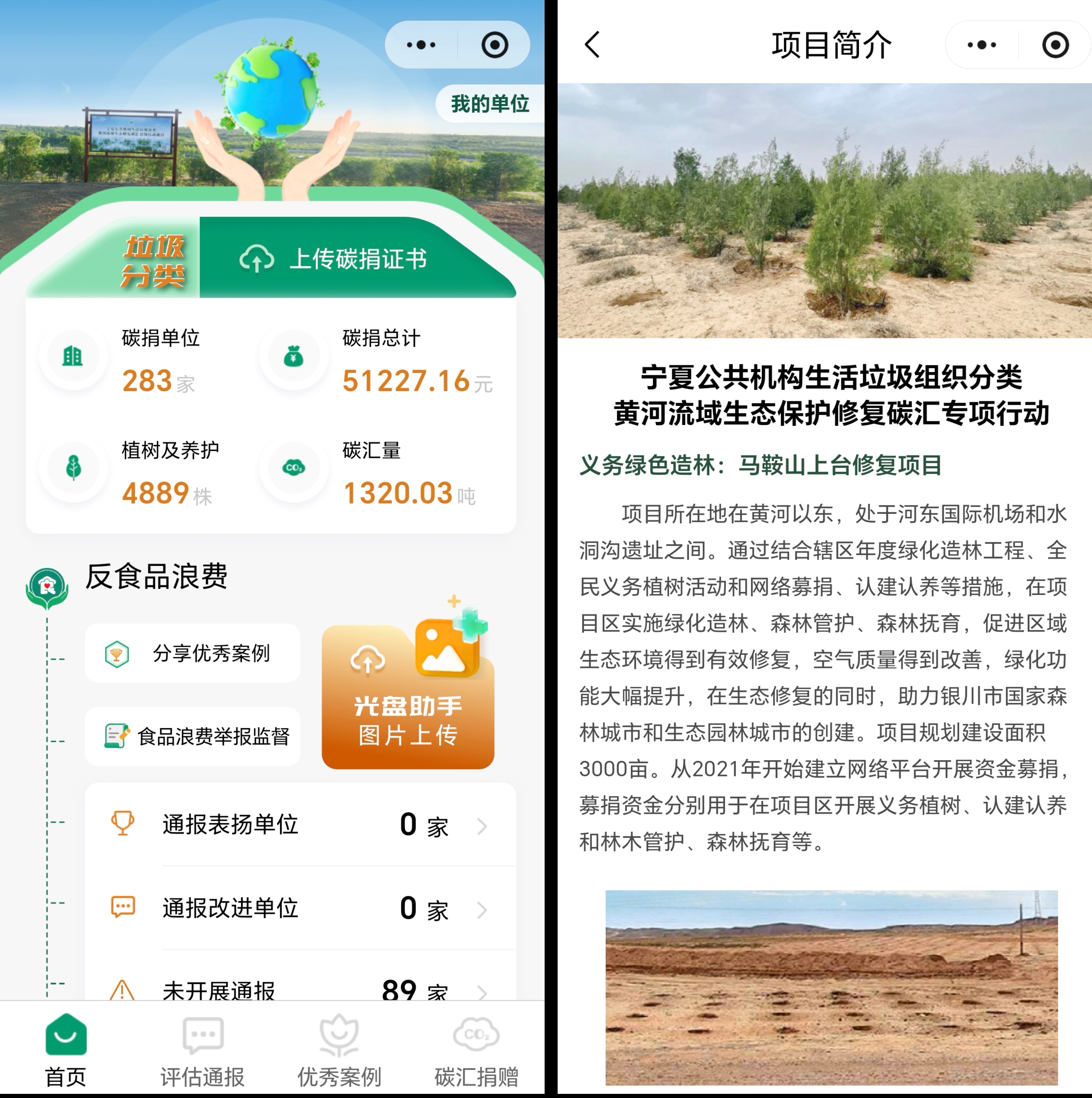 公共机构作为社会公共服务的重要提供者,其节约能源资源的行为对于引领全社会形成绿色低碳风尚有着不可或缺的示范作用。2022年,自治区机关事务管理局与林业和草原局共同启动了“宁夏公共机构生活垃圾分类黄河流域生态修复碳汇捐赠引领行动”,将公共机构产生的可回收物收益,即使用财政资金购买的纸张、报纸、包装物等低值易耗办公用品废弃变卖后产生的收益,通过“碳汇捐赠”方式用于植树造林和植被养护。2024年,该项目在中国绿化基金会的支持下,更名为“碳绿未来行动”全国公益试点项目并在民政部备案。