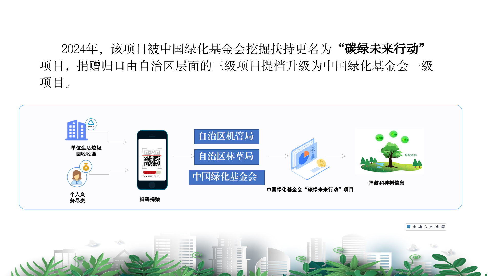 视频会上,宁夏机关事务管理局围绕“碳绿未来行动”的策划理念、运行机制、实践成效及下一步展望作了详细汇报。该项目自2022年由宁夏机关事务管理局联合林业和草原局发起,创新性地将公共机构使用财政资金购买的低值易耗品废旧后产生的可回收物收益,通过碳汇捐赠定向用于黄河流域生态修复,对于助力实现“双碳”目标具有着积极作用。2024年,项目得到中国绿化基金会支持,并通过民政部备案为全国公益试点项目,正式开启从地方探索到全国试点的升级之路。在运行机制方面,构建起“部委指导、地方试点、部门联动”的协同模式,形成“公共机构可回收物收益——碳汇捐赠——植树造林”的绿色闭环。宁夏机关事务管理局牵头规范全区公共机构生活垃圾分类回收流程,建立常态化回收机制,确保每一笔可回收物收益都能精准归集;宁夏林业和草原局则发挥专业优势,严格把控苗木种植与养护质量,让“绿色资金”切实转化为可量化的生态效益。截至目前,宁夏公共机构累计捐赠林业碳汇量1441.53吨,这些源自日常办公废弃的可回收物,已经在黄河流域生态修复线上转化为精心抚育的苗木,为黄河沿岸防风固沙、涵养水源筑牢生态屏障。