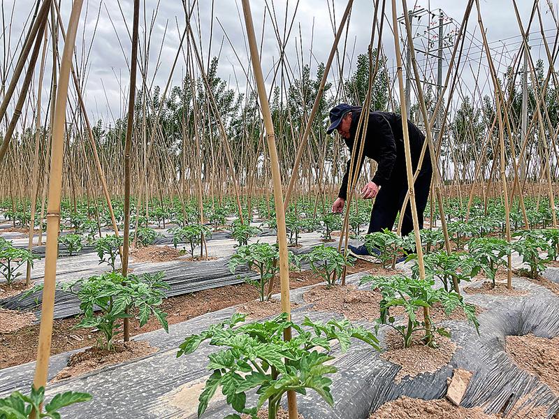 新民村的农田里,一排排西红柿幼苗在高高的竹竿上“赛着伴儿”地长,为它们提供生命之源的是埋在膜下的一条条管道——滴灌带,这也正是农业节水灌溉的有力“法宝”。