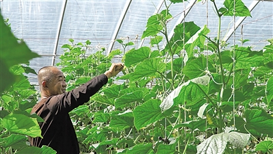 走进现代化反季节蔬菜大棚内,村民张小军正忙着采摘。他在东华村承包了4个大棚,种植新品种“粉冠一号”西红柿。5月底,这些西红柿成熟后,通过配送方式,预计可以挣到10万元。在张小军的大棚里,每天有15位村民从事剪条、锄草、架杆、采摘等农活。他告诉记者,7月份以后,还能再种一茬西红柿、茄子,再收入一笔。