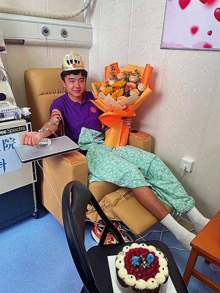 7月7日9点,在湖南省湘雅三医院内科楼造血干细胞采集室,马欢头戴生日皇冠,过了一个特别的20岁生日。吴荣 摄