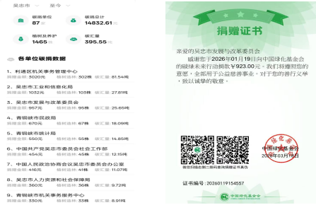指尖植绿,山间增绿。积极响应自治区机管局、林业和草原局号召,动员全市各级党政机关广泛参与“碳绿未来行动”,累计捐赠14832.61元,先后在宁夏灵武白芨滩国家级自然保护区新种植及抚育管护植被1465株,碳汇量达395.55吨,实现了从“指尖”到“山间”的跨越,以实际行动为生态修复注入强劲动能。